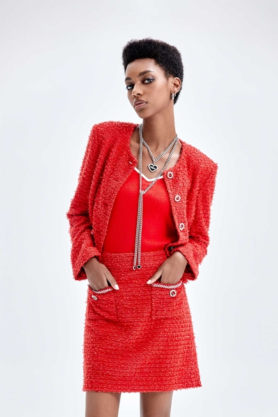 V領長袖夾克式外套 流行火焰色 領圈拼接羅紋造型 雙口袋 前中拉鍊閉合 愛心拉環